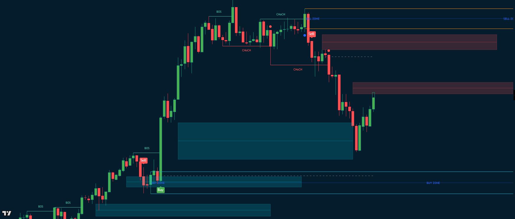 This indicator is a multi-strategy, multi-component technical analysis tool designed to help traders identify supply and demand zones , market structure , order blocks , fair value gaps (FVGs) , trend reversals , and RSI-based signals , among other price action elements.